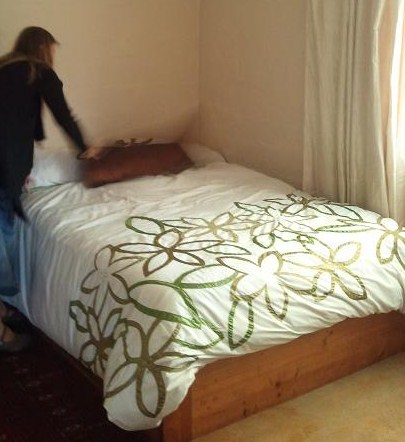 The main bedroom is simply and tastefully furnished with a persian carpet and double bed with a soft duvet. There are no visible medical trappings, no stirrups(Ugh!), no waist level delivery bed, no pipes or metal trolleys. Karen stores her medical requirements in a wooden cupboard and only brings them out when needed. There is running water in the kitchen and an ample bathroom with toilet and shower. Women choose their positions for labour and birth, and there are no rules as to how they should behave! karen encourages them with a loving touch, the right words and a soft hand in the back, and after the birth, the mother and baby spend the night in the ‘clinic’ with a mothering ‘doula’ from the area. Karen visits them in the following days and they know where to find her when they need help.